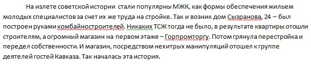 На излете советской истории стали популярны МЖК, как формы обеспечения жильем молодых специалистов за счет их же труда на стройке. Так и возник дом Сызранова, 24 – был построен руками комбайностроителей. Никаких ТСЖ тогда не было, в результате квартиры отошли строителям, а огромный магазин на первом этаже – Горпромторгу. Потом грянула перестройка и передел собственности. И магазин, посредством нехитрых манипуляций отошел к группе деятелей гостей Кавказа. Так началась эта история.